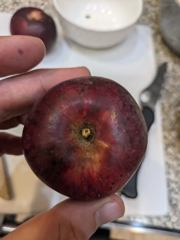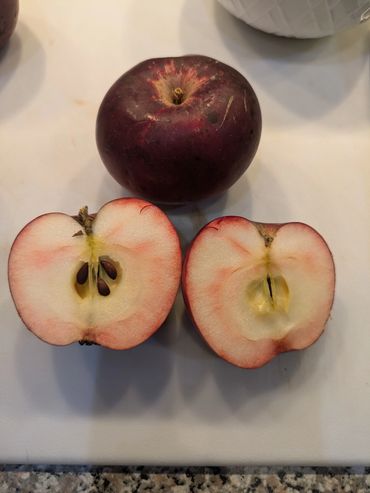 The apple is dark red and some of them are almost black. It's a small to medium apple that's crisp, sweet and has red streaks throughout the flesh giving it some berry flavors in the background.