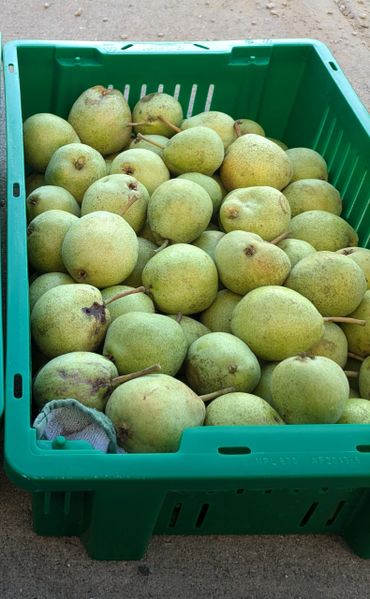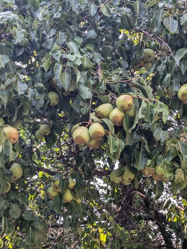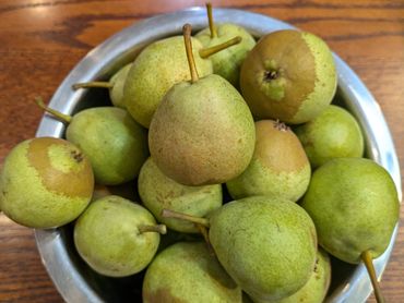 The Admin pear is a large beautiful tree with no obvious disease issues. It's a smallish green pear with some occasional russeting on the bottom. It's an early summer pear that will ripen on the tree for fresh eating. It's very sweet and juicy with a honey-like after taste. It can also be picked underripe and it will be crunchy and sweet with a bit of tartness. It will also ripen on the counter after a week or two.