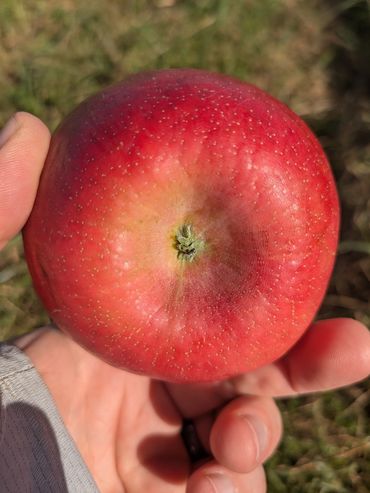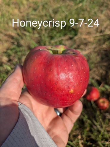 Honeycrisp is a relatively large apple that ripens in early September. It's a cold hardy apple that was developed at the University of Minnesota in the 1960's.