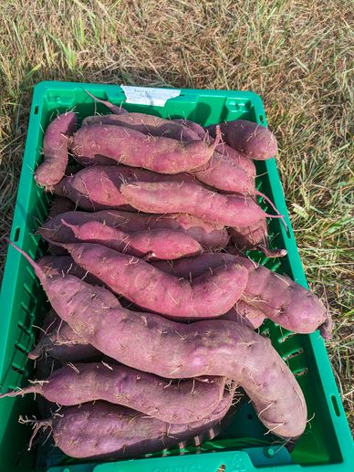 A common misconception is that sweet potatoes don't grow well in Iowa. Nothing could be further from the truth. There are many varieties that do great in our climate. Sweet potatoes come in a variety of colors too. This variety, called Becca's Purple, has purple skin and deep purple flesh with a nice mild sweetness. We currently grow 13 different varieties of sweet potato on the farm. Most of them heirloom varieties.